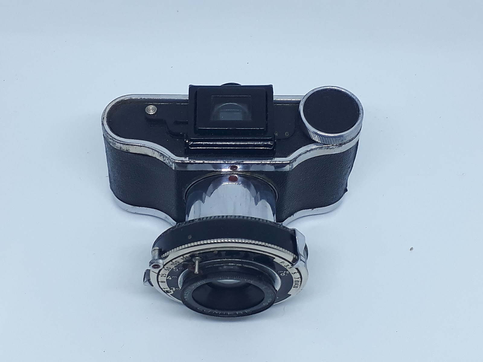 Se trata de la famosa mini Cámara HIT de fabricación japonesa allá por los años 40 y 50 del pasado siglo. Este modelo que fue el primero de muchos de los que se fabricaros después de la Gran Guerra creó escuela, muchos fabricantes hicieron modelos parecidos para película de 17,5mm (la mitad de 35mm) y de 16 mm. tanto fue el éxito de esta cámara que se empezaron a llamar Cámaras HIT a todas las que se fabricaban con este tipo de película.
